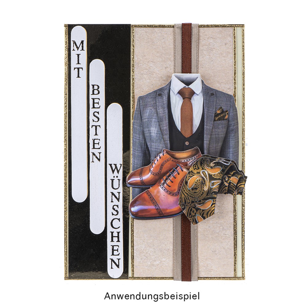 10 edle, ausgestanzte 3-D Motive "Elegante Herren-Klassiker", mit Spotlack-Veredelung, ca. 7,5 cm bis 10 cm.