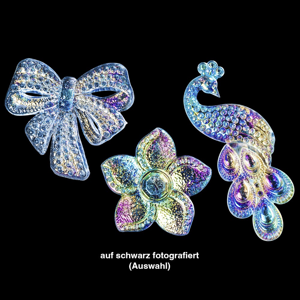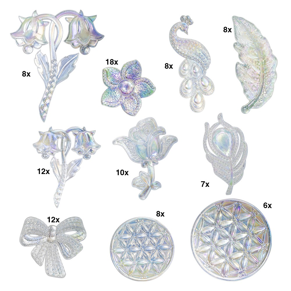 Mit diesem Set erhalten Sie 97 irisierende Kristallkunst-Schmucksteine in 10 verschiedenen Designs. Setzen Sie damit funkelnde Akzente auf Grußkarten, Tischkärtchen, Geschenkverpackungen, Acrylformen, Vasen, Bilderrahmen und vielem mehr. Besonders effektvoll kommen die Schmucksteine auch auf Teelichtgläsern, Laternen oder beleuchteten Flaschen zur Geltung, da das durchscheinende Licht ihren wunderschönen Schimmer noch verstärkt. Sie können die Kristallkunst-Schmucksteine auch ganz einfach farblich umgestalten, indem Sie sie von der Rückseite bemalen. Wir empfehlen hierzu unsere Premium-Brush-Marker für ein intensives Ergebnis oder die Permanent-Marker für eine dezente Farbgestaltung. Lassen Sie Ihrer Kreativität freien Lauf!