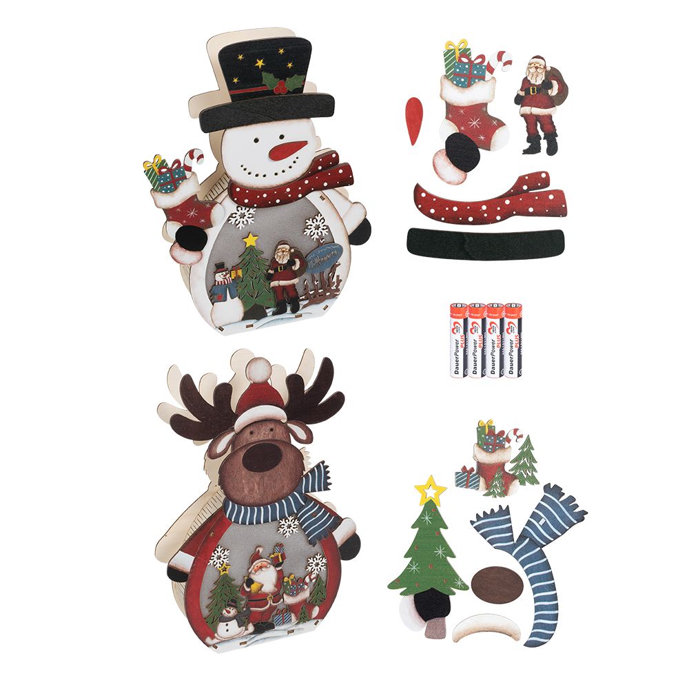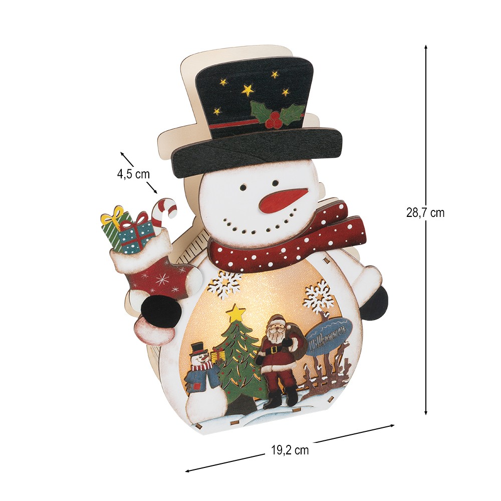 - 3-D LED-Aufsteller, Schneemann, 28,7 cm x 19,2 cm, 4,5 cm tief, aus Holz, 5 Holzelemente selbstklebend, mit Lichteffekt-Folie und 3 LEDs in Warmweiß, mit Timer