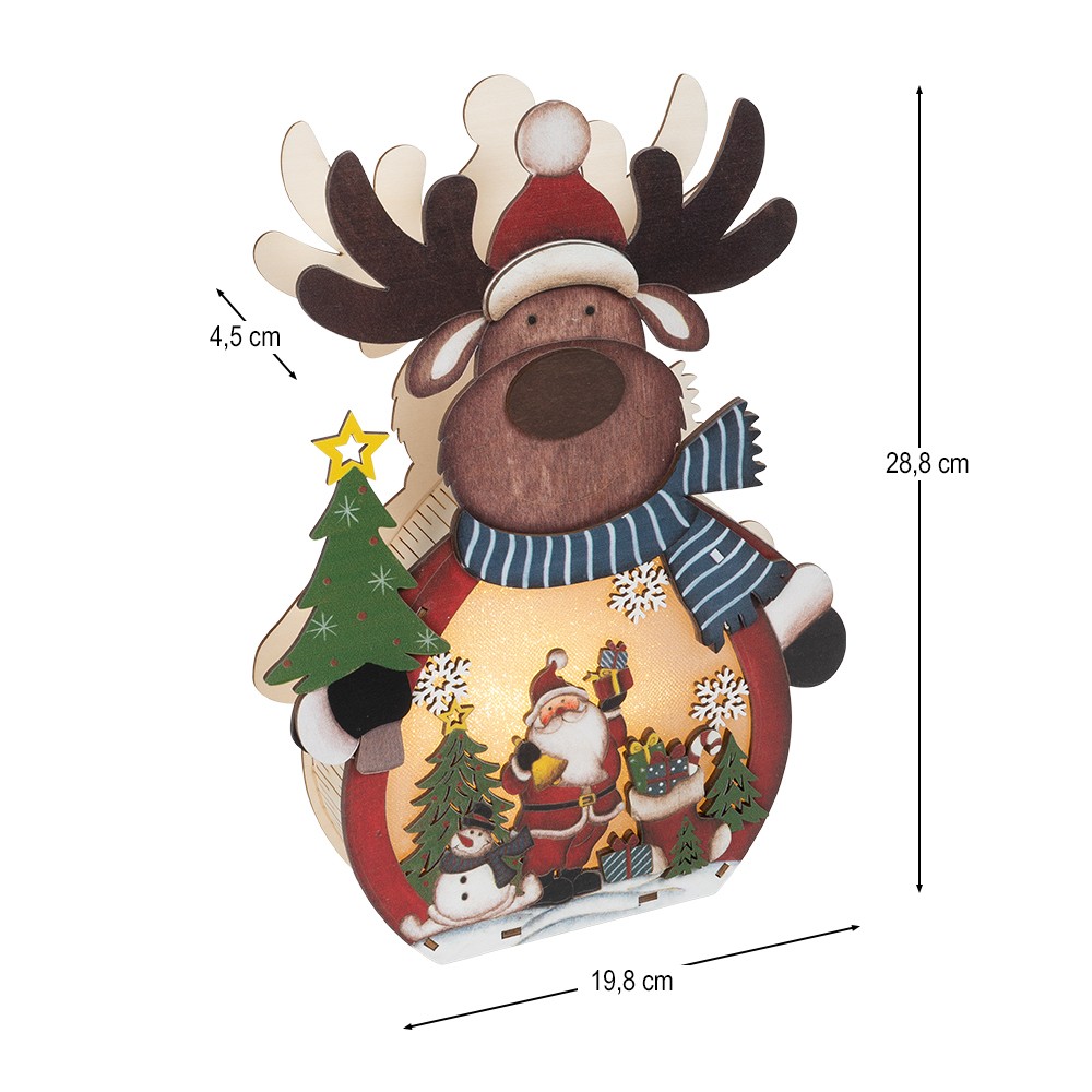 - 3-D LED-Aufsteller, Rentier, 28,8 cm x 19,8 cm, 4,5 cm tief, aus Holz, 5 Holzelemente selbstklebend, mit Lichteffekt-Folie und 3 LEDs in Warmweiß, mit Timer