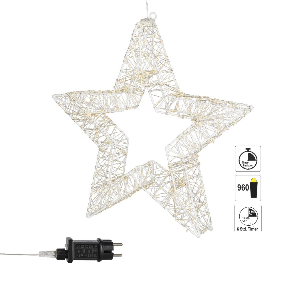 Mit dem weißen LED-Metallstern im modernen Design setzen Sie stilvolle winterliche Akzente in Ihrem Zuhause. 960 warmweiße LEDs lassen ihn hell erstrahlen und sorgen in der dunklen Jahreszeit für eine gemütliche, stimmungsvolle Atmosphäre. Durch seine hochwertige Verarbeitung und das elegante Design ist der Stern auch ganz ohne weitere Deko ein toller Blickfang. Er eignet sich aber auch hervorragend für diverse Bastelarbeiten. Kombinieren Sie ihn zum Beispiel mit weihnachtlicher Floristik, verzieren Sie ihn mit Perlen oder platzieren Sie Deko-Figuren in der Mitte. Durch seine Tiefe von fast 5 cm und einer Metallöse an einer Spitze kann der Stern sowohl aufgehängt als auch selbststehend verwendet werden und sorgt wahlweise im Fenster, auf der Fensterbank oder Dekoration im Regal für eine festliche Stimmung. Mit einem 5 Meter langen Kabel ist der netzbetriebene LED-Stern nahezu überall einsetzbar und dank seiner IP44 Zertifizierung sogar auch im Außenbereich. Darüber hinaus verfügt er über eine praktische Timer-Funktion: Wenn Sie den Schalter am Netzstecker einmal drücken, leuchtet der Stern dauerhaft, durch zweimaliges Drücken aktivieren Sie den Timer (6 Stunden Betrieb, dann 18 Stunden Pause) und durch ein drittes Mal Drücken schalten Sie ihn aus.