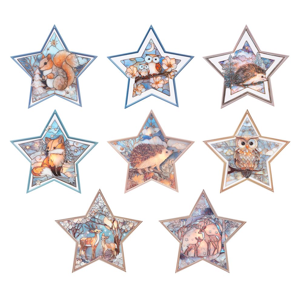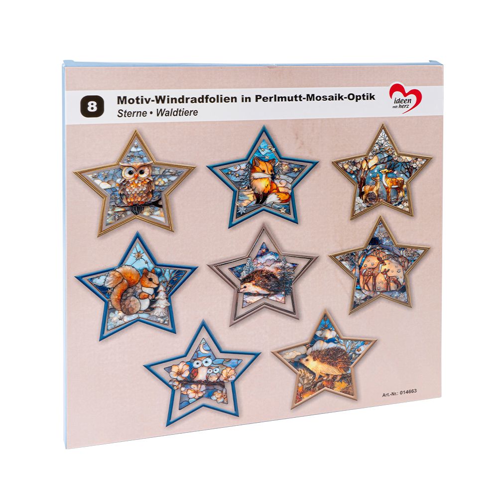 Produktinformationen "Motiv-Windradfolien, Perlmutt-Mosaik-Optik, Sterne, Waldtiere, 23,8cm x 24,9cm,, 8 Designs, 8 Stück"