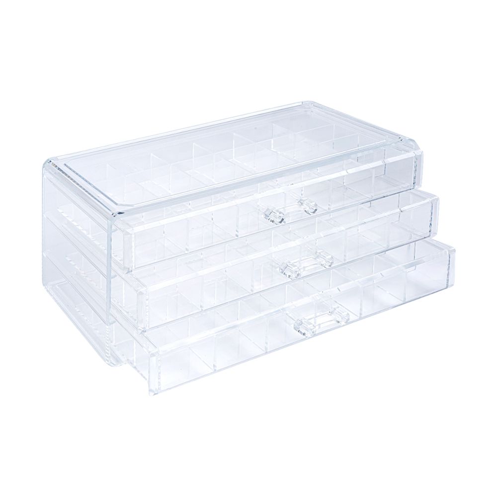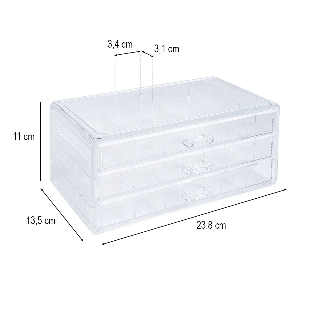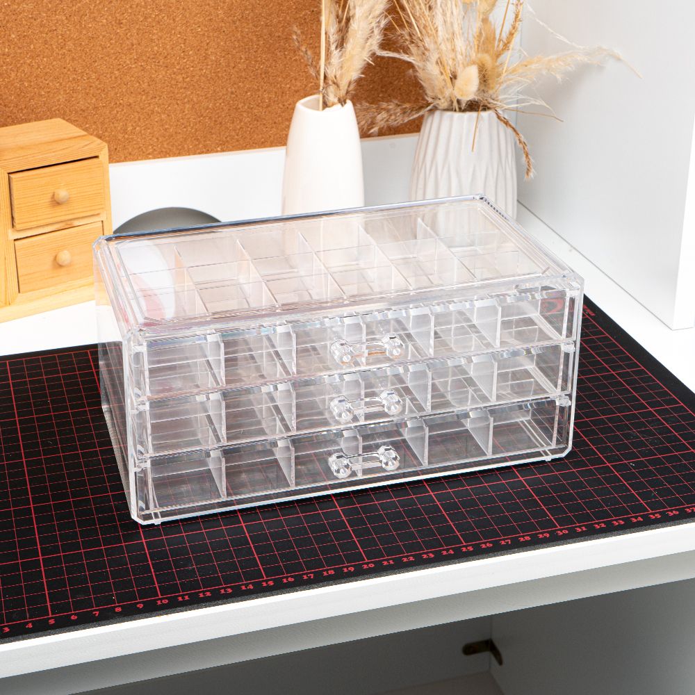 Mit der praktischen Sortier- und Aufbewahrungsbox behalten Sie immer den Überblick über ihre Bastelmaterialien. Drei Schubladen bieten insgesamt 72 separate Aufbewahrungsfächer – perfekt, um Perlen, Pailletten, Knöpfe, Schmuckzubehör, Kleinteile, Schrauben oder andere Bastelutensilien ordentlich und griffbereit zu verstauen. Jede Schublade ist mit 24 gleich großen Fächern (3,1 cm x 3,4 cm x 2,3 cm) ausgestattet, die ausreichend Platz für all Ihre Materialien bieten. Dank der klaren, transparenten Ausführung sehen Sie sofort, was sich in jedem Fach befindet. Mit ihrer kompakten Größe eignet sich die Box ideal für den Basteltisch, das Regal oder den mobilen Einsatz bei Workshops und Kursen. Ob Hobbybastler, Schmuckdesigner oder kreative Ordnungsliebhaber – diese Sortierbox ist ein zuverlässiger Helfer für mehr Struktur, Übersicht und Freude beim kreativen Arbeiten.