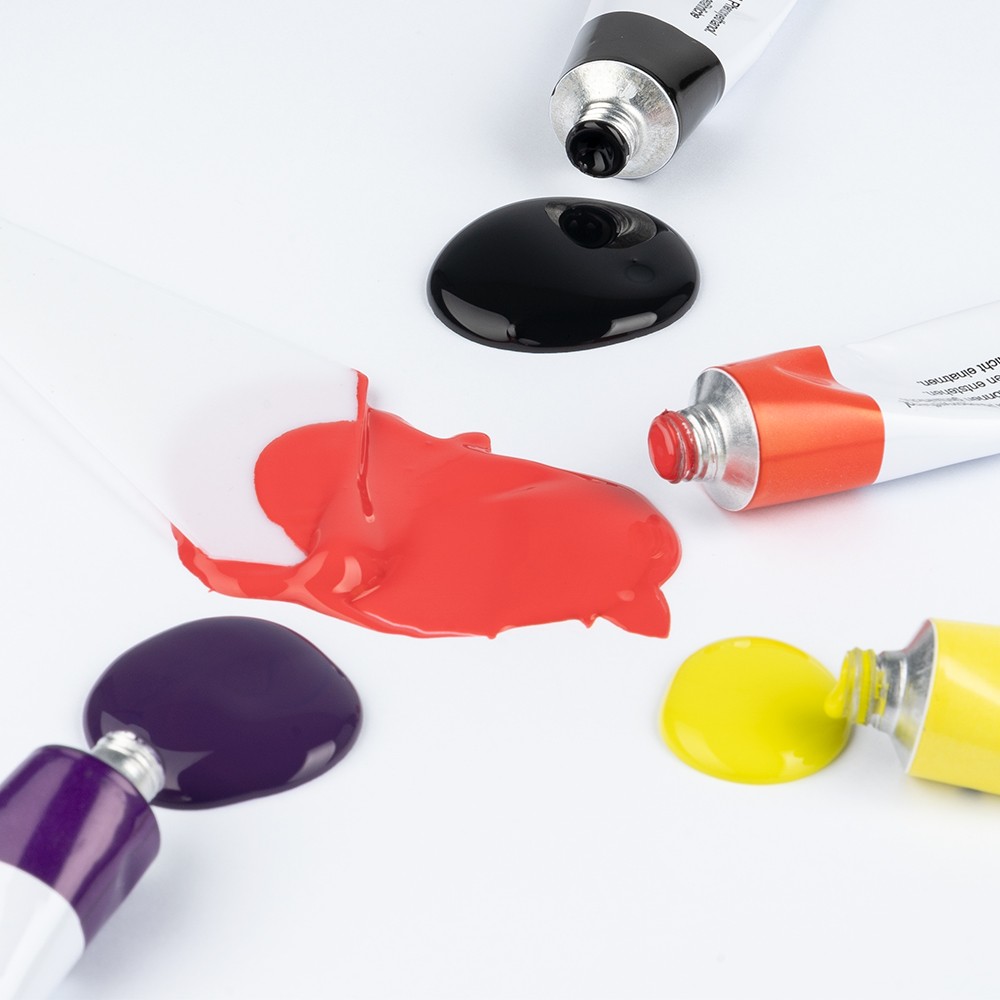 Farben: 3 x Weiß, Mittel-Gelb, Gelb-Ocker, Sienna, Orange-Gelb, Rot, Dunkelrot, Hellrot, Pink, Violett, Preußisch Blau, Phthalo Blau, Ultramarine Blau, Kobald Blau, Cerulean Blau, Smaragdgrün, Hellgrün, Preußisch Grün, Phthalo Grün, Hellbraun, Dunkelbraun, Schwarz