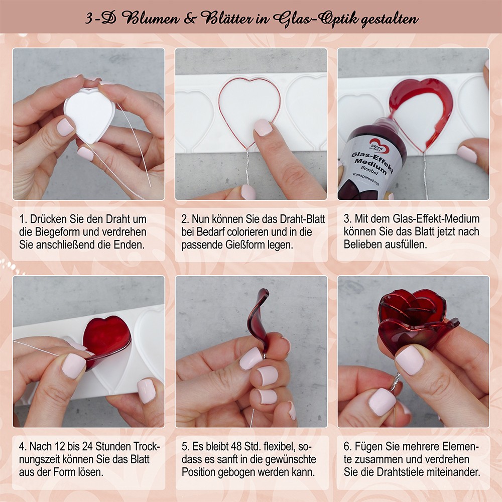 Das Glas-Effekt-Medium ist eine wasserbasierte Farbe zur Gestaltung von Kunstwerken in Glaskunst-Optik. Die Farben sind untereinander mischbar und haben eine Trocknungszeit von 12 bis 24 Stunden. Anschließend bleiben sie für ca. 48 Stunden flexibel, sodass die gegossenen Formen problemlos in die gewünschte Position gebogen werden können.