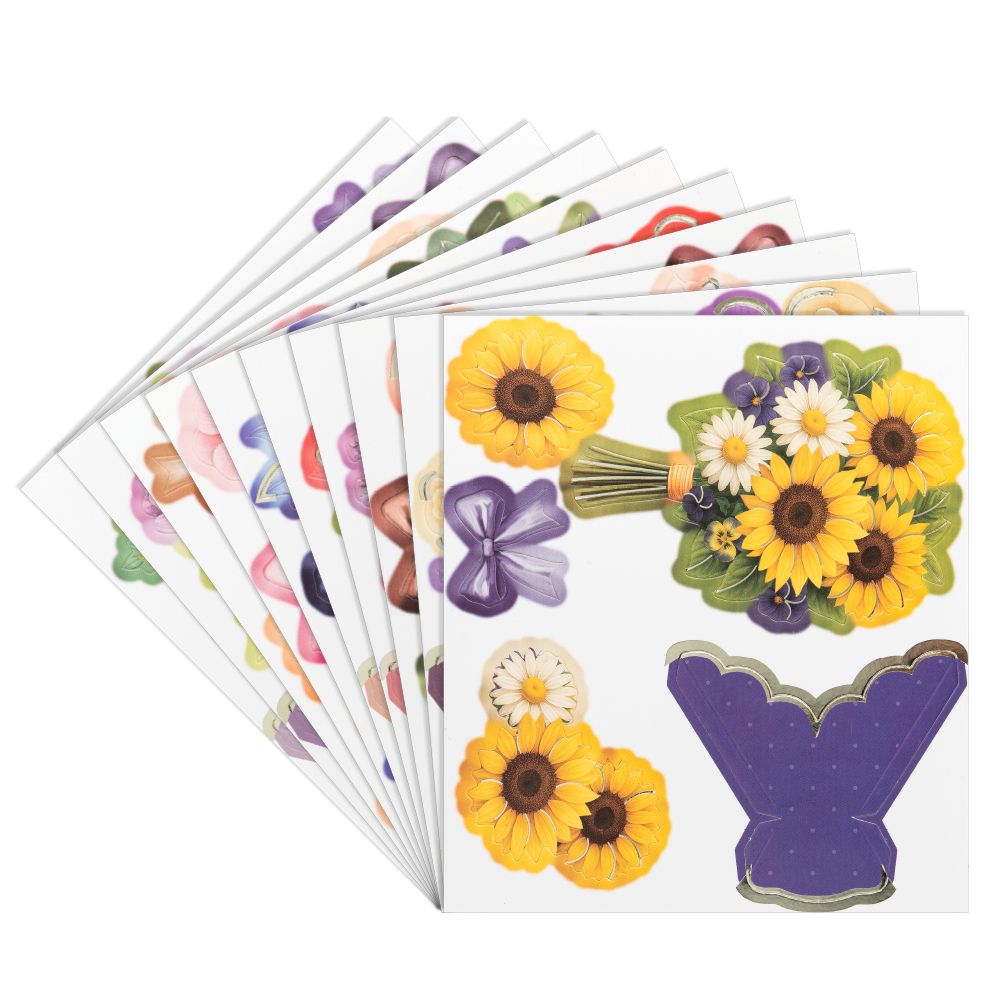 Gestalten Sie mit diesem Set ausgefallene Grußkarten in 3D-Optik. Neben 10 Karten in verschiedenen Pastellfarben und passenden weißen Briefumschlägen sind auch 10 Bogen mit unterschiedlichen 3-D Motiven enthalten. Das Besondere ist, dass sie in diesem Fall nicht nur drei, sondern fünf Ebenen haben, wodurch die Motive noch plastischer wirken. Jedes Motiv besteht aus einem bunten Blumenstrauß mit drei Ebenen, einer Blumentüte und einer Schleife, die abschießend auf die Tüte gesetzt werden kann. Der Zusammenbau ist kinderleicht: Setzen Sie den Blumenstrauß wie gewohnt mit Schaumklebepads zusammen und falten Sie die Kanten der Blumentüte entlang der Nutlinien. Kleben Sie sie anschließend mit den Klebelaschen auf die Karte, befestigen Sie nach Belieben die Schleife daran und stecken Sie den Blumenstrauß abschließend in die Blumentüte. Nun können Sie die Karte ganz nach Belieben weiterverzieren und ihr mit Bordüren, Stickern oder Transfermotiven Ihre eigene Note verleihen.