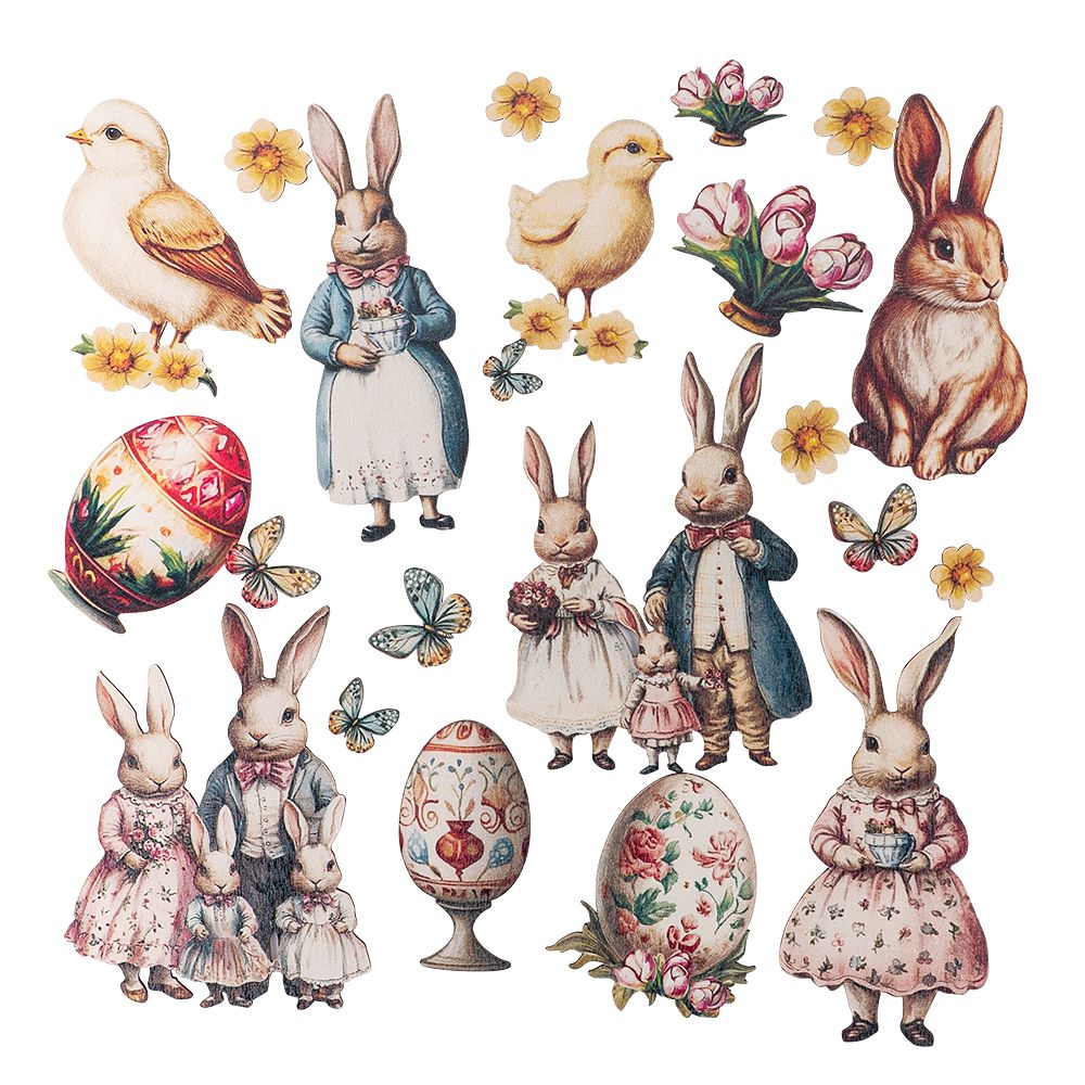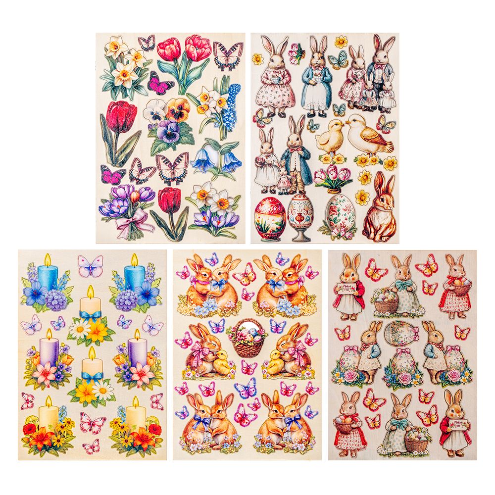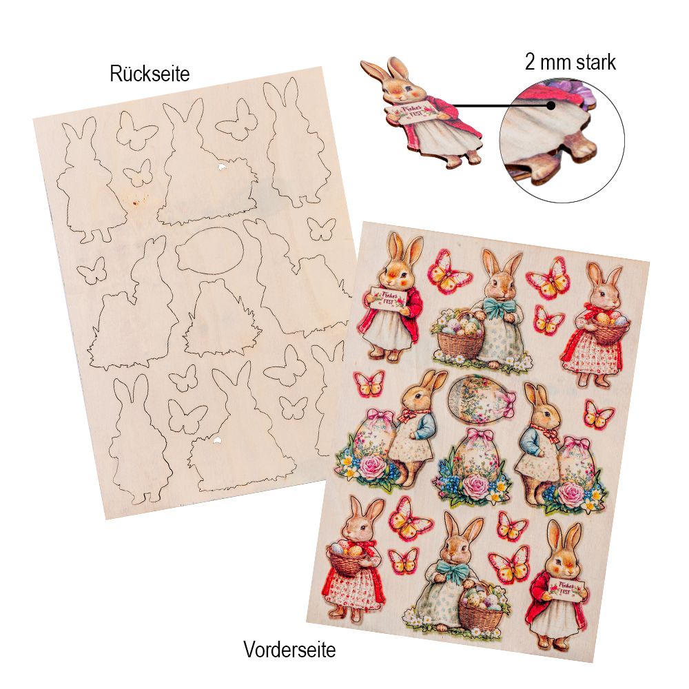 5 Motiv-Holz-Laserbogen, Frühling/Ostern, DIN A4, 2 mm stark, verschiedene Designs, farbig bedruckt