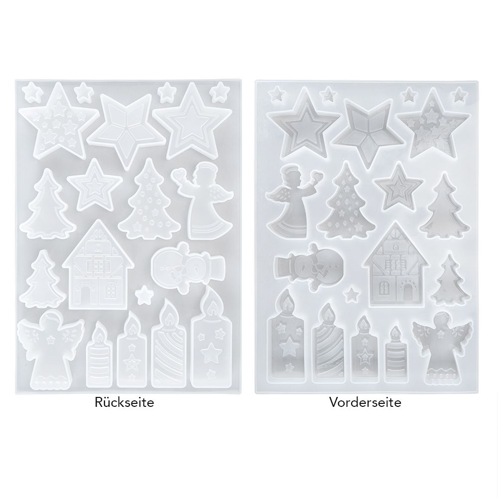 Gestalten Sie mit dieser Silikonform zahlreiche weihnachtliche Formen, die Sie für die verschiedensten Bastelarbeiten verwenden können. Gießen Sie die Formen zum Beispiel aus Epoxidharz, UV-Resin-Lack oder Gips, je nachdem, ob Sie ein transparentes oder opakes Ergebnis erhalten möchten. Auch mit Faszina- oder Pappmaché-Modelliermasse können Sie die Formen füllen und spielend einfach Abdrücke erstellen. Die Formen verfügen zum größten Teil über eine strukturierte Vorderseite und haben eine glatte Rückseite, sodass sie sich ideal für die Grußkartengestaltung eignen. Aber auch Geschenkverpackungen oder weihnachtliche Dekorationen wie Kränze, Girlanden oder Gestecke können damit wunderbar verziert werden. Färben Sie Ihre Gieß- oder Modelliermasse nach Belieben ein oder bemalen Sie die fertigen Formen nach der Trocknungszeit. Ihrer Kreativität sind keine Grenzen gesetzt!