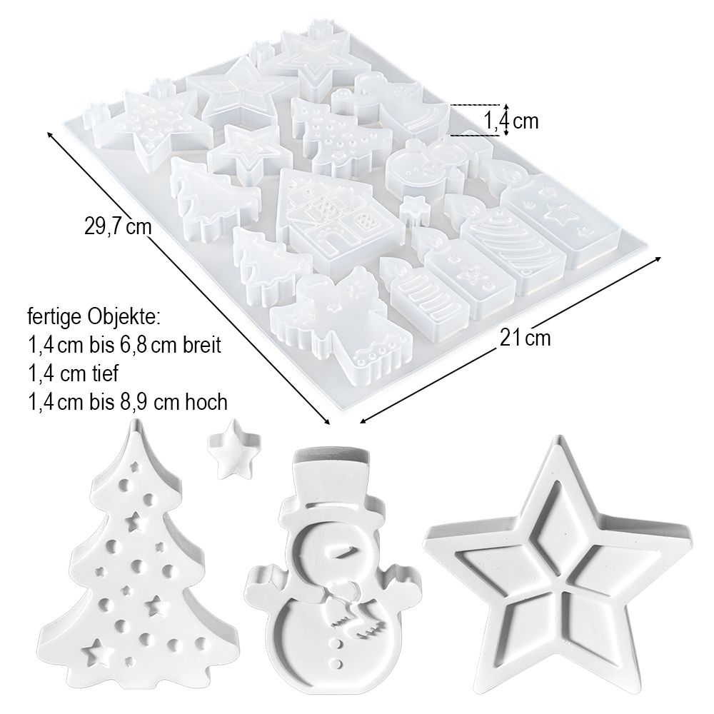 Silikonform Winter/Weihnachten, DIN A4, 6 verschiedene Formen in verschiedenen Größen und Designs, lebensmittelecht