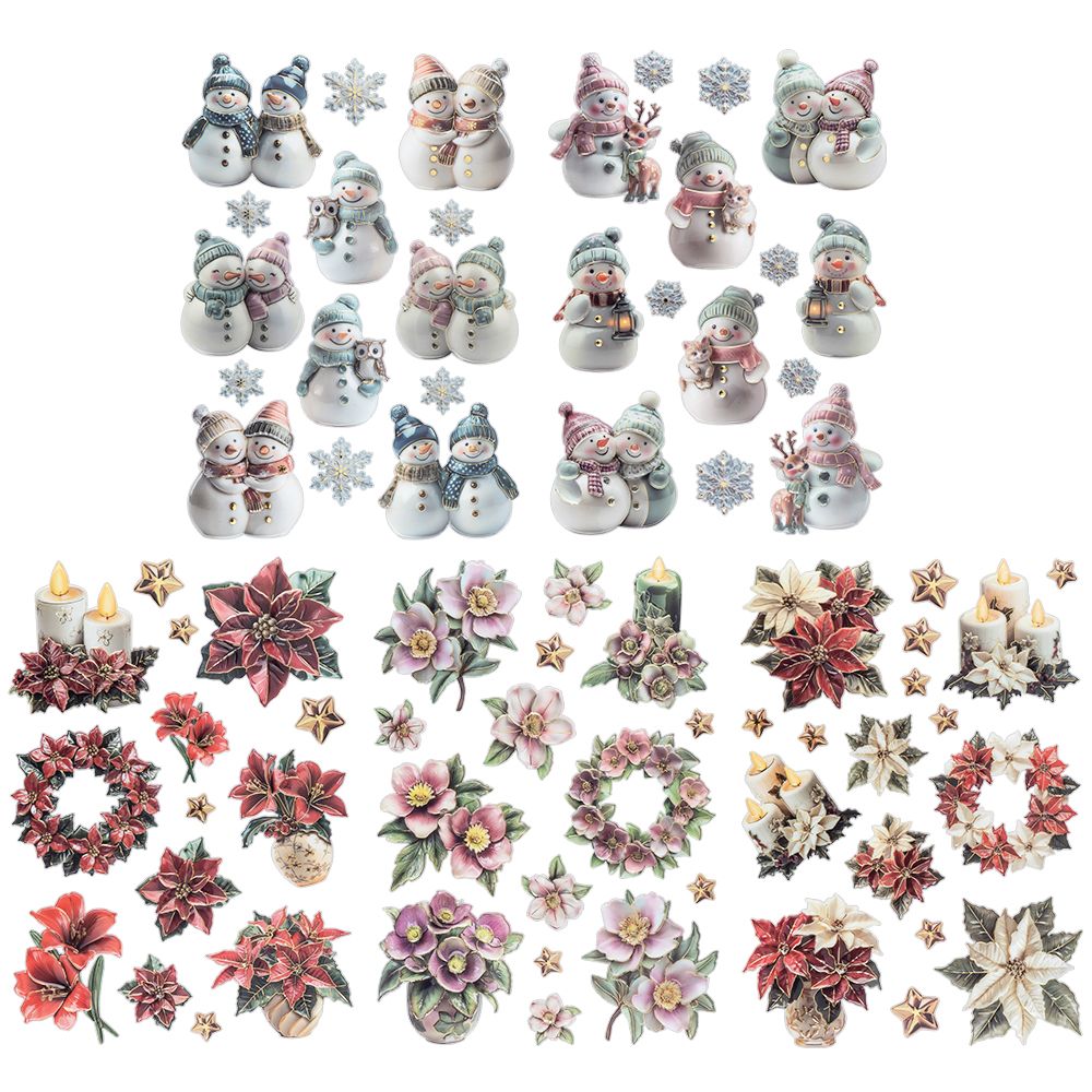 3-D Relief-Sticker, Porzellan-Optik, Weihnachtsfloristik & Schneemänner, versch. Größen, 5 Bogen
