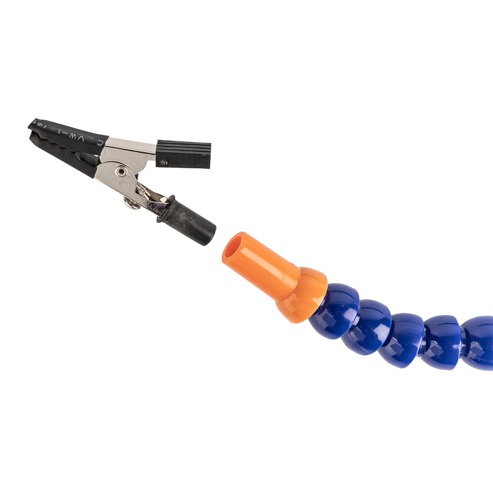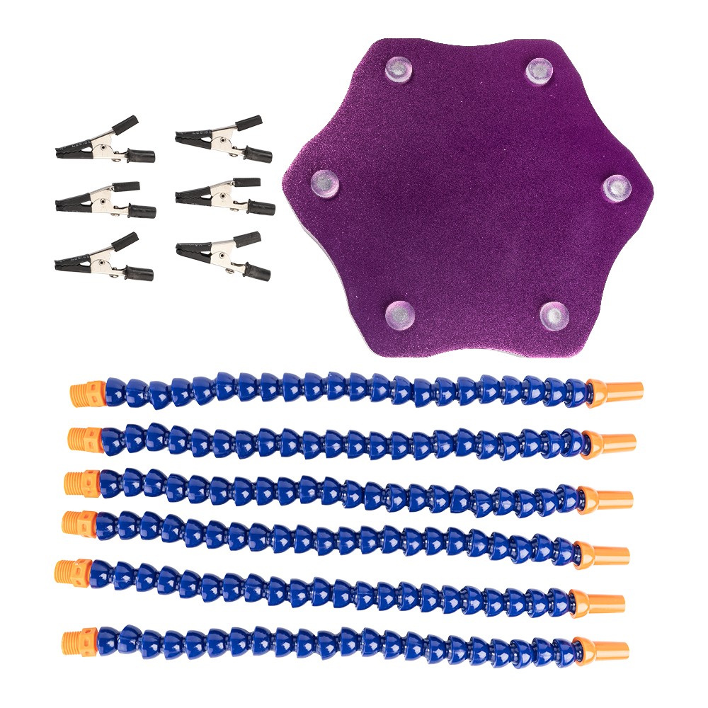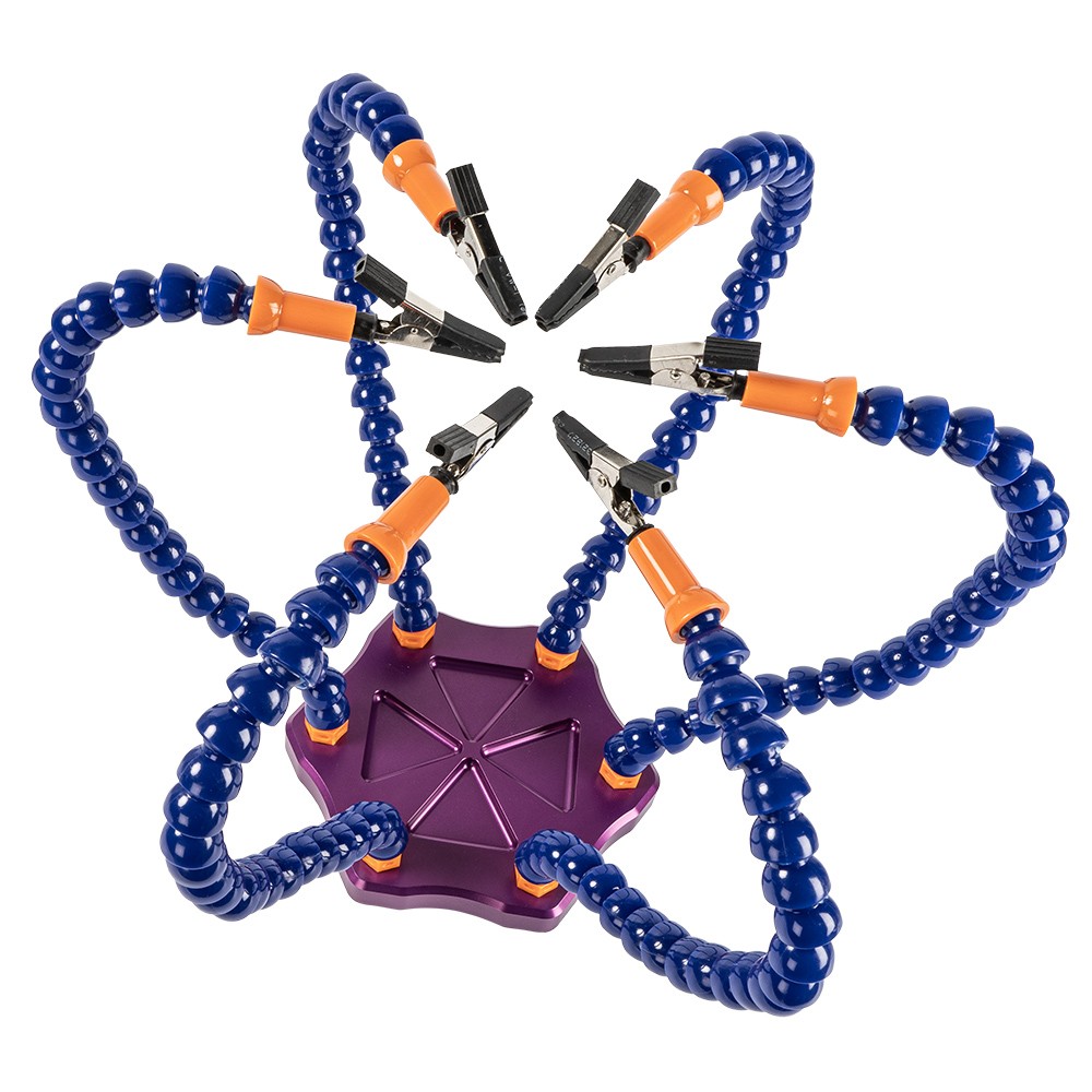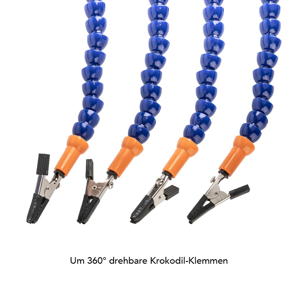 Die vielseitig einsetzbaren „helfenden Hände“ bestehen aus einer stabilen Sockelplatte, in deren Öffnungen die sechs flexiblen Arme durch einfaches Drehen der Mutter am unteren Ende jedes Arms eingefügt werden. In die Öffnung am oberen Ende jedes flexiblen Arms wird eine der Krokodilklemmen geschoben. Nun können die einzelnen Arme nicht nur beliebige Gegenstände sicher und kratzerfrei greifen, sondern auch in jede Richtung gebogen und um 360° gedreht werden. Lassen Sie an Ihrer „helfenden Hand“ zum Beispiel bemalte und lackierte Gegenstände Trocknen oder beglimmern Sie einen Gegenstand rundherum, während die „helfende Hand“ den Gegenstand hält und Sie Ihre beiden Hände frei haben.