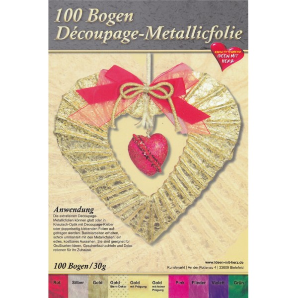 100 Bogen Decoupage-Metallicfolie, 10 verschiedene Designs á 10 Bogen, 30 g/m², DIN A4.