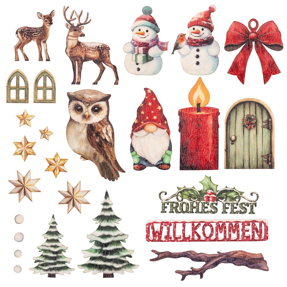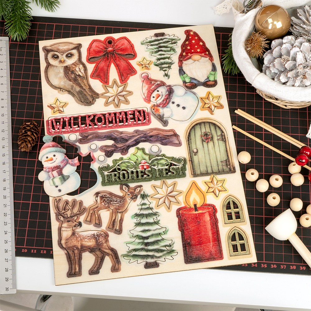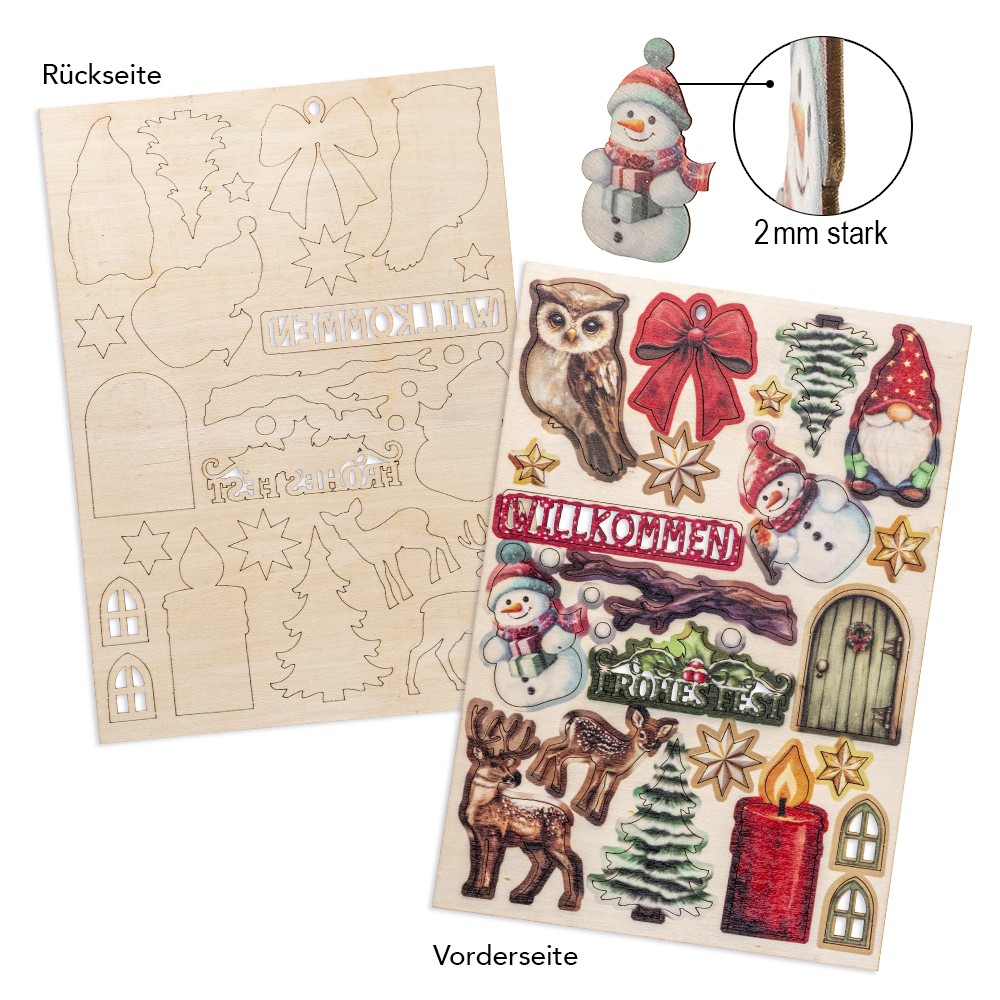 Verleihen Sie Ihren Bastelprojekten in der Winter- und Weihnachtszeit eine besondere Note mit dem hochwertigen Motiv-Holz-Laserbogen im DIN A4-Format. Der 2 mm starke Bogen besteht aus Pappelsperrholz und ist mit verschiedenen, liebevoll gestalteten Winter- und Weihnachtsmotiven farbig bedruckt. Dank präziser Lasertechnik lassen sich die einzelnen Motive leicht und sauber aus dem Bogen herausdrücken. Ob für Karten, Geschenkanhänger, Tischdeko, Adventskalender oder kreative Scrapbooking-Ideen: Die detailreichen Holzmotive sind vielseitig einsetzbar und sorgen für eine warme, natürliche Optik.