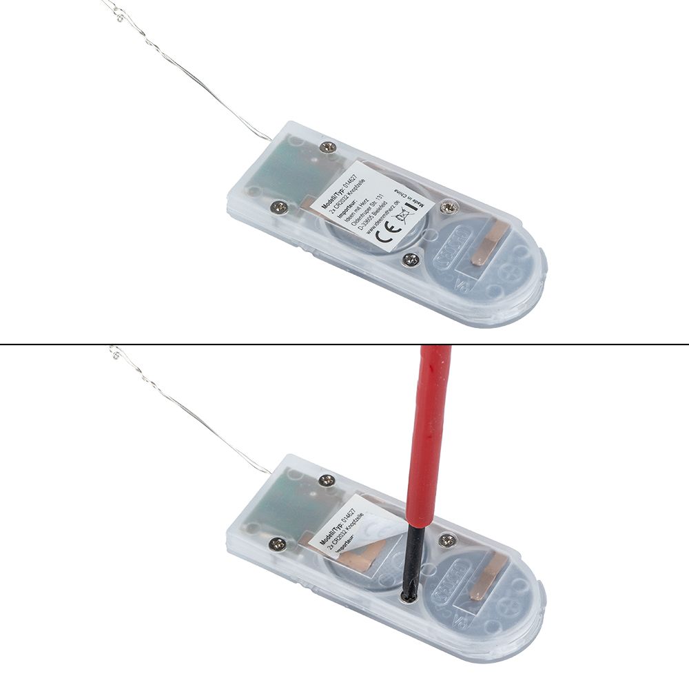 Die LED-Kerzenflamme wird mit zwei Batterien vom Typ CR2032 betrieben, die bereits enthalten sind. Ziehen Sie zur Inbetriebnahme einfach die Schutzfolie an der vorgesehenen Lasche heraus und drücken Sie auf den Schalter am Batteriefach. Je nach Belieben können Sie durch einmaliges Drücken die Timerfunktion aktivieren (6 Stunden an, 18 Stunden aus) oder das Drahtlicht durch zweimaliges Drücken auf Dauerbetrieb stellen.