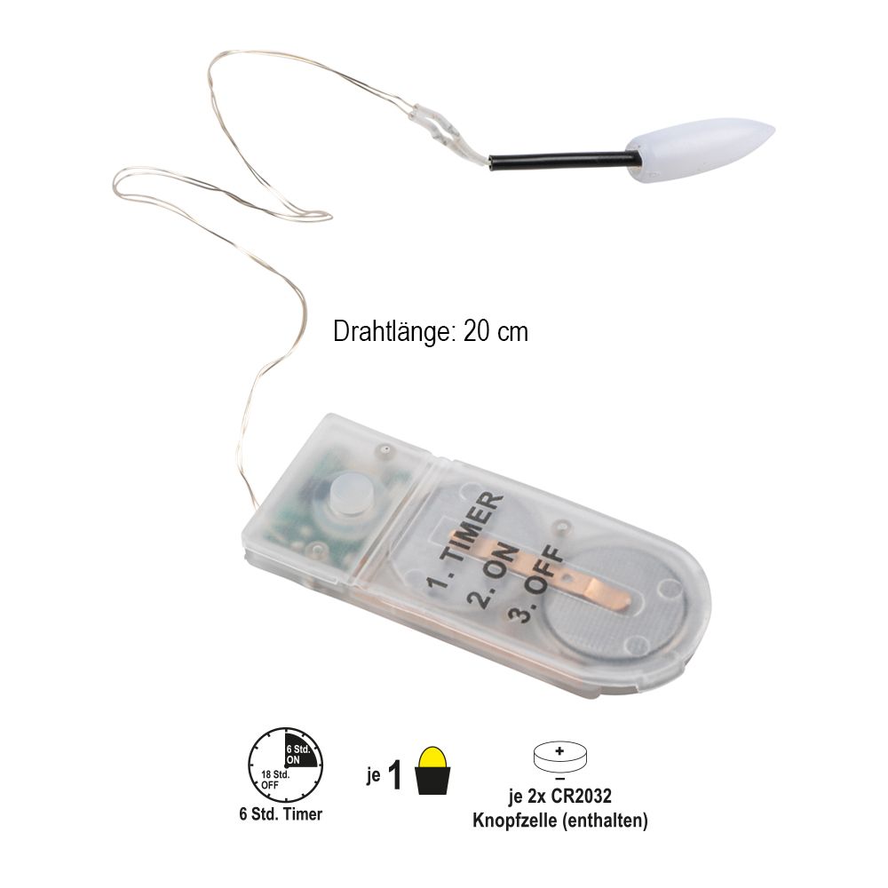 LED-Kerzenflamme am Draht, mit Flackereffekt, warmweiß, mit Timer, batteriebetrieben (2x CR2032, enthalten)