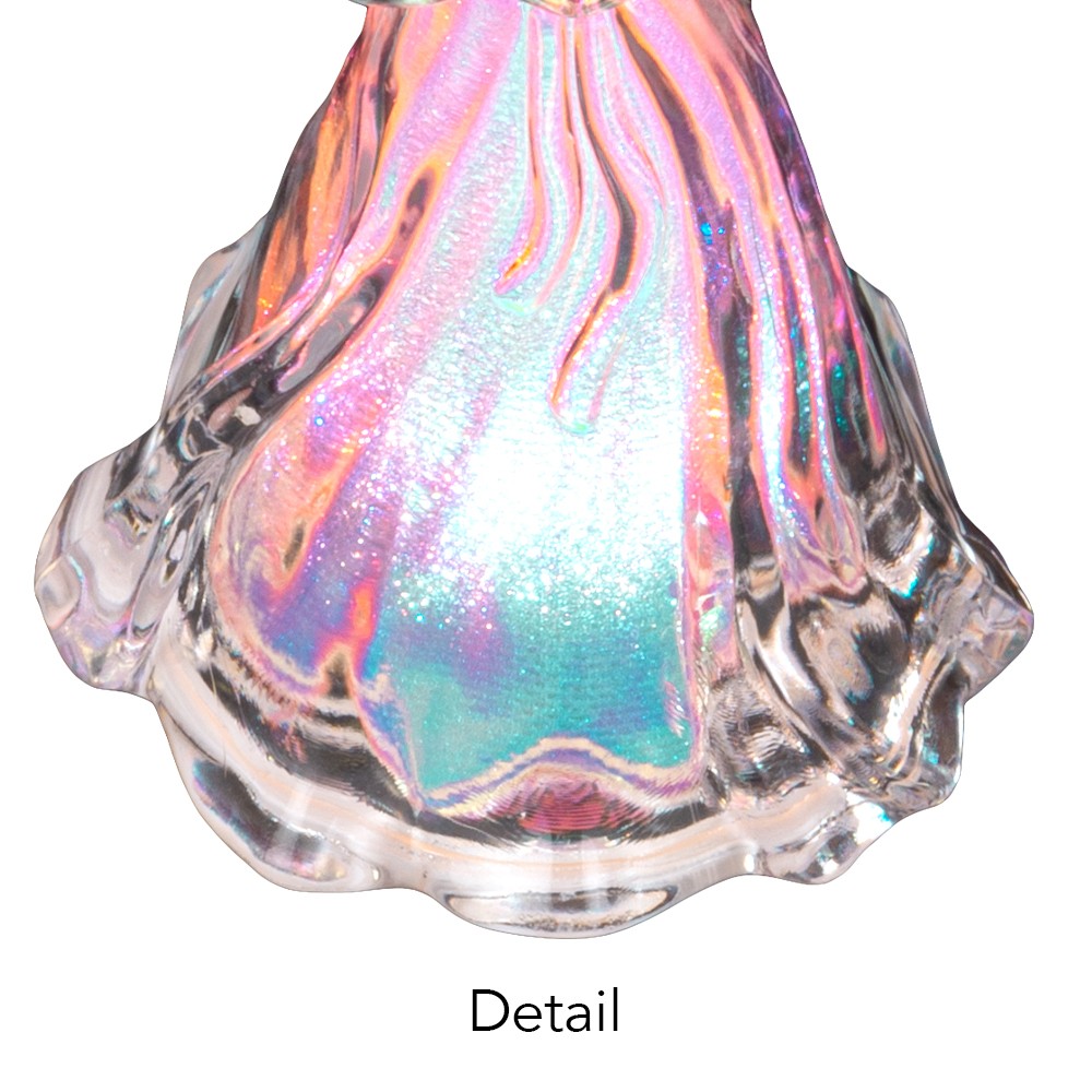 Verleihen Sie Ihrer Weihnachtsdekoration einen Hauch von Magie mit diesen kunstvoll gestalteten Engeln aus transparentem Kunststoff. Im Inneren der Figuren befindet sich eine warmweiße LED-Beleuchtung, die die irisierenden Röcke in schillernden Farben erstrahlen lässt. Die goldenen Flügel sorgen für eine festliche, elegante Optik.