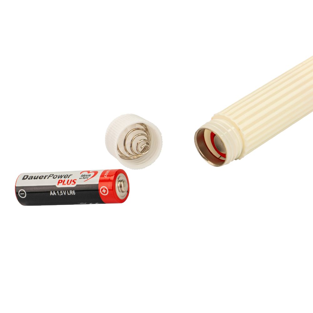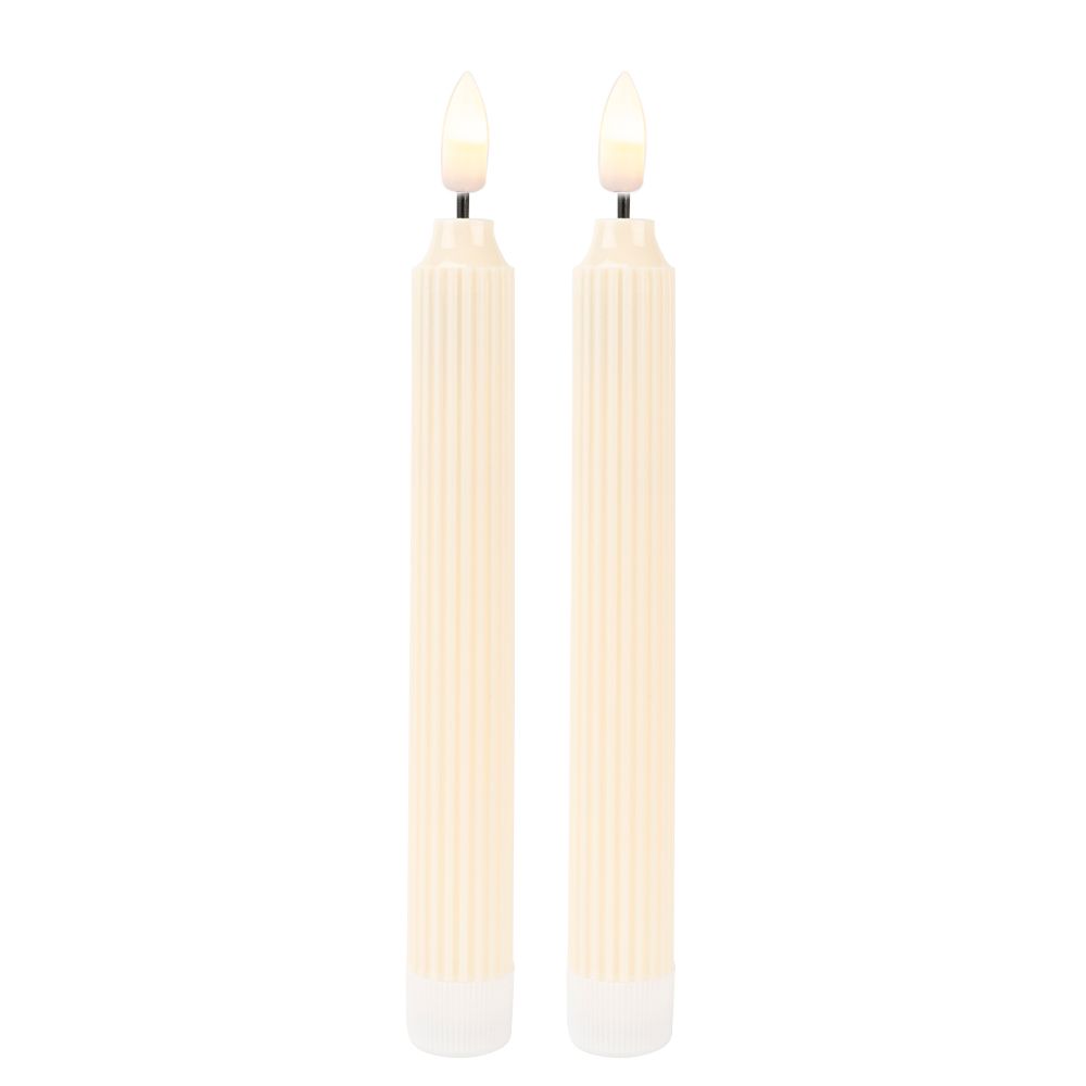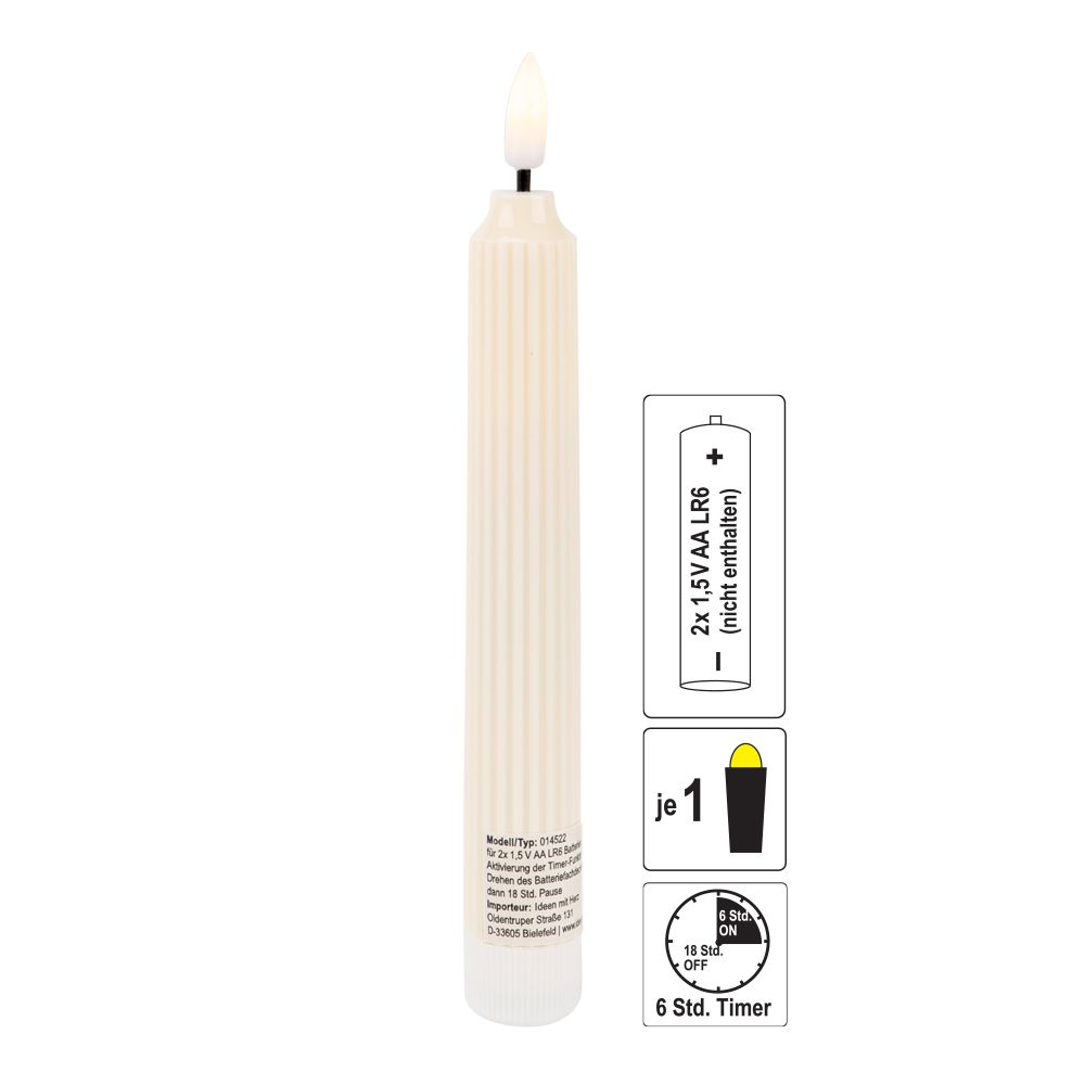 Setzen Sie mit den cremefarbenen LED-Stabkerzen im angesagten Retro-Design stilvolle Akzente in Ihren Dekorationen. Die beiden Kunststoff-Kerzen sind mit jeweils einer warmweißen LED ausgestattet, die mit einem leichten Flacker-Effekt das Licht einer echten Kerze überzeugend simuliert. Damit sind die Kerzen eine tolle Alternative für Tisch- oder Fensterdekorationen, ganz ohne Ruß, Hitze oder Wachstropfen. Mit einem Durchmesser von 2 cm passen sie in handelsübliche Kerzenständer, können aber auch ohne weitere Halterung aufgestellt werden. Besonders schön kommen die LED-Stabkerzen in floralen Arrangements zur Geltung und eignen sich damit auch hervorragend für festliche Dekorationen, zum Beispiel an Feiertagen, bei Hochzeiten oder an Geburtstagen.Die beiden Stabkerzen werden mit jeweils zwei Batterien vom Typ AA betrieben, die nicht enthalten sind. Durch einfaches Drehen des weißen Bodenteils öffnen Sie das Batteriefach und können die Kerzen ein- und ausschalten. Sobald sie leuchten, startet automatisch eine praktische Timer-Funktion. Die Kerzen leuchten nun für 6 Stunden, schalten sich danach von selbst aus und beginnen 18 Stunden später erneut zu leuchten.