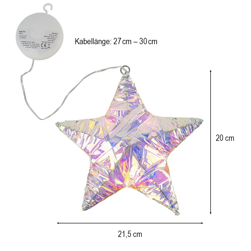3-D LED-Stern mit irisierender Folie in Streifen, zum Aufhängen, 21,5 cm x 20 cm x 4 cm, 20 LEDs in Warmweiß, mit Timer