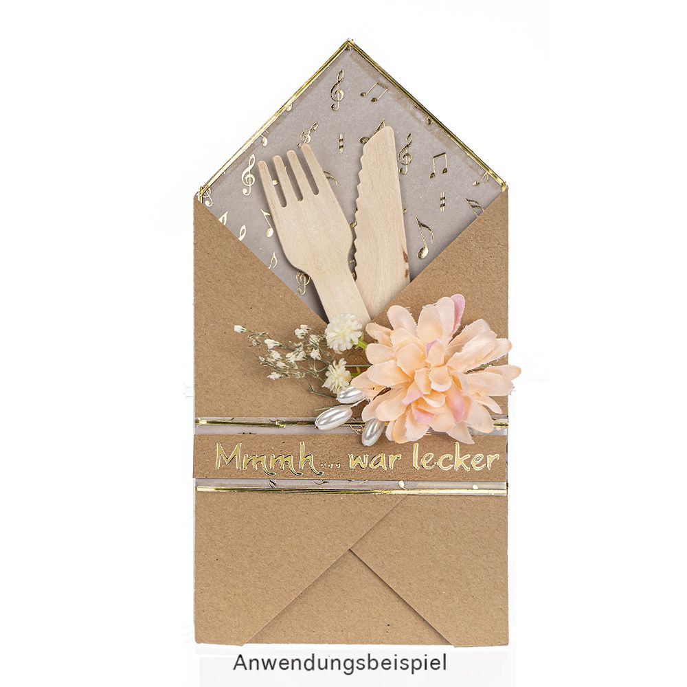 15-teiliges Holzbesteck, 5 Gabeln, 5 Messer, 5 Löffel, 14 cm lang, 1,5 cm bis 3 cm breit.